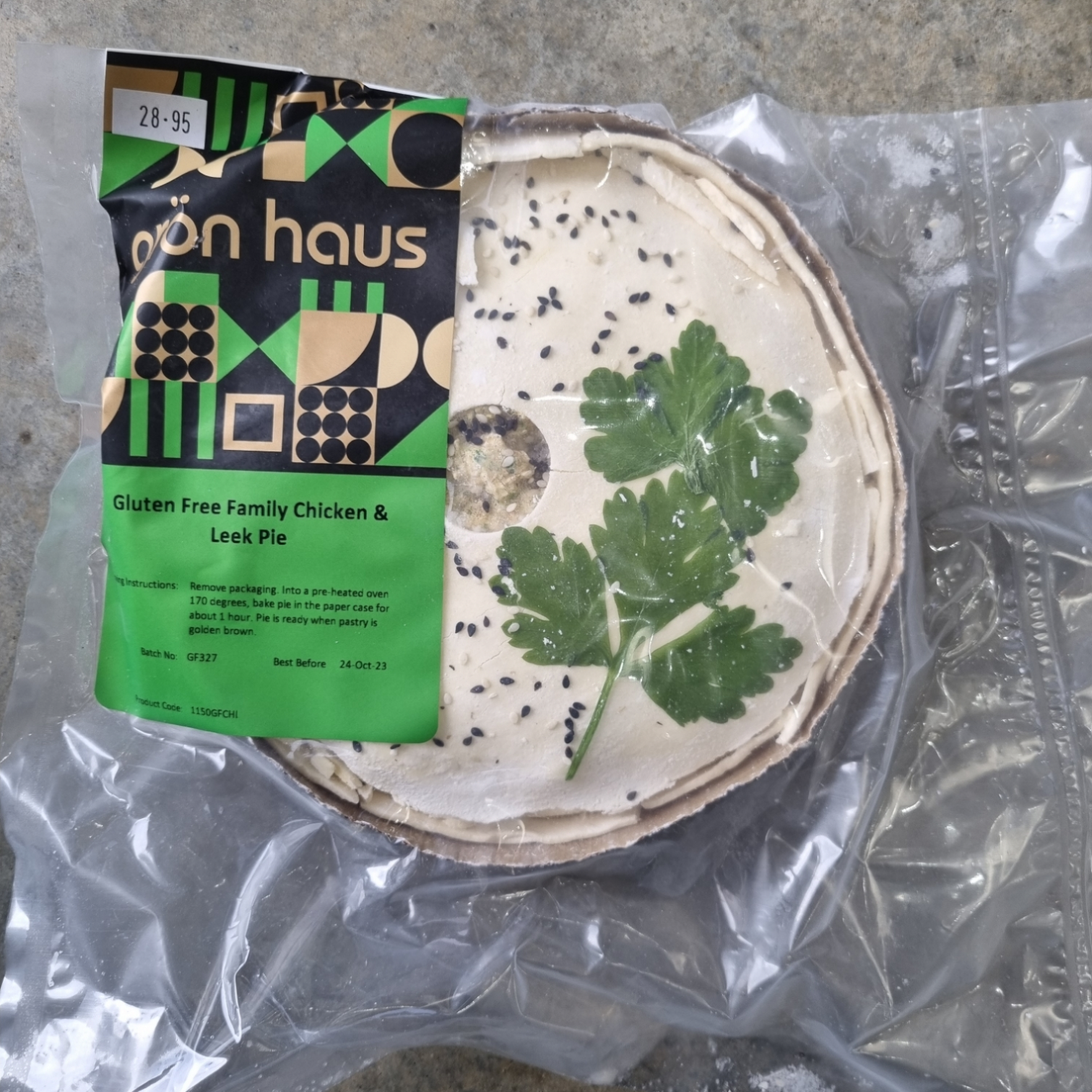 DESCRIPTION: A creamy chicken and leek filling baked in our signature Gron Haus gluten free flaky pastry. This pie is made with onion and garlic products and may not be suitable for those with fructose malabsorption allergies. Snap frozen and vacuum packed, ready to be baked fresh, or for the freezer.