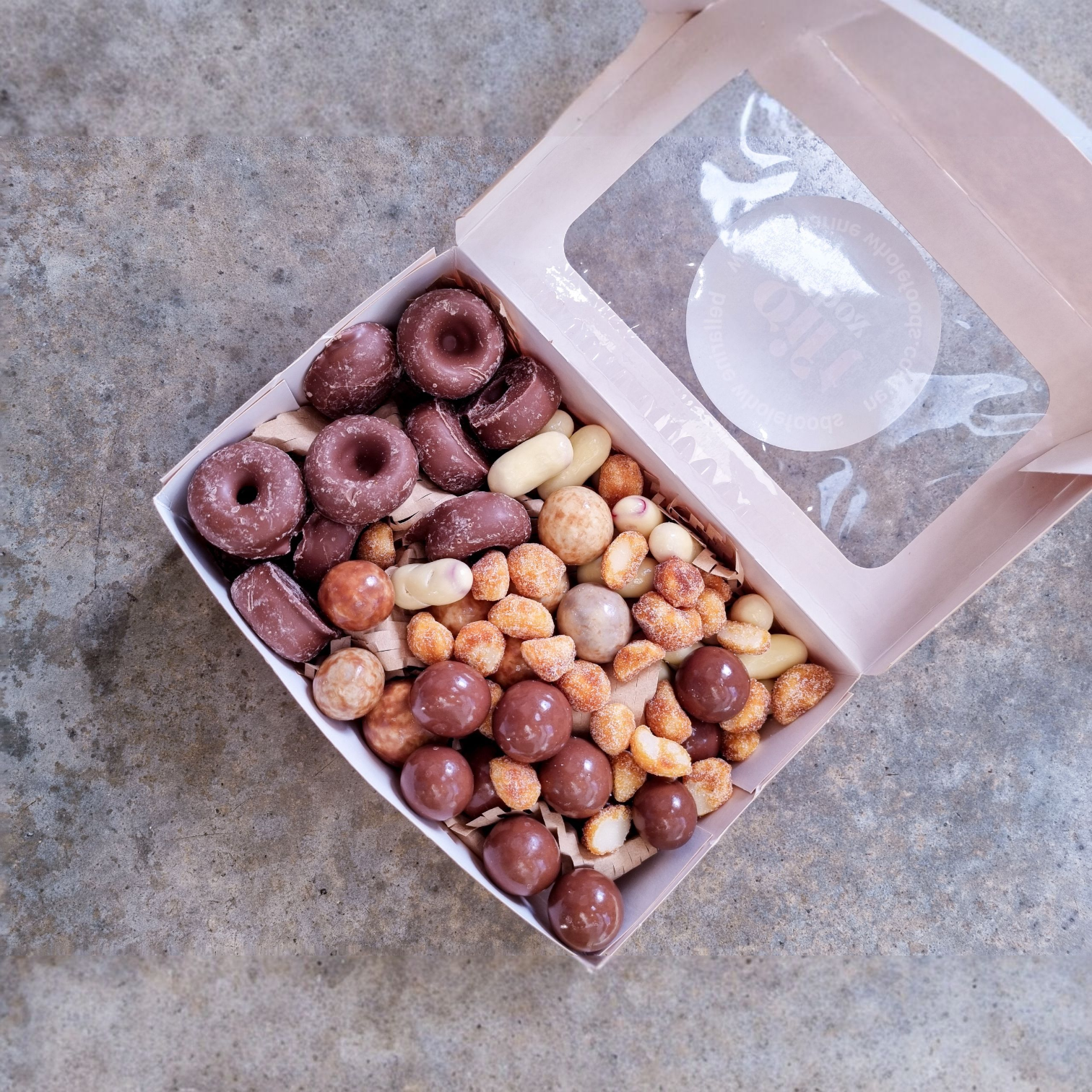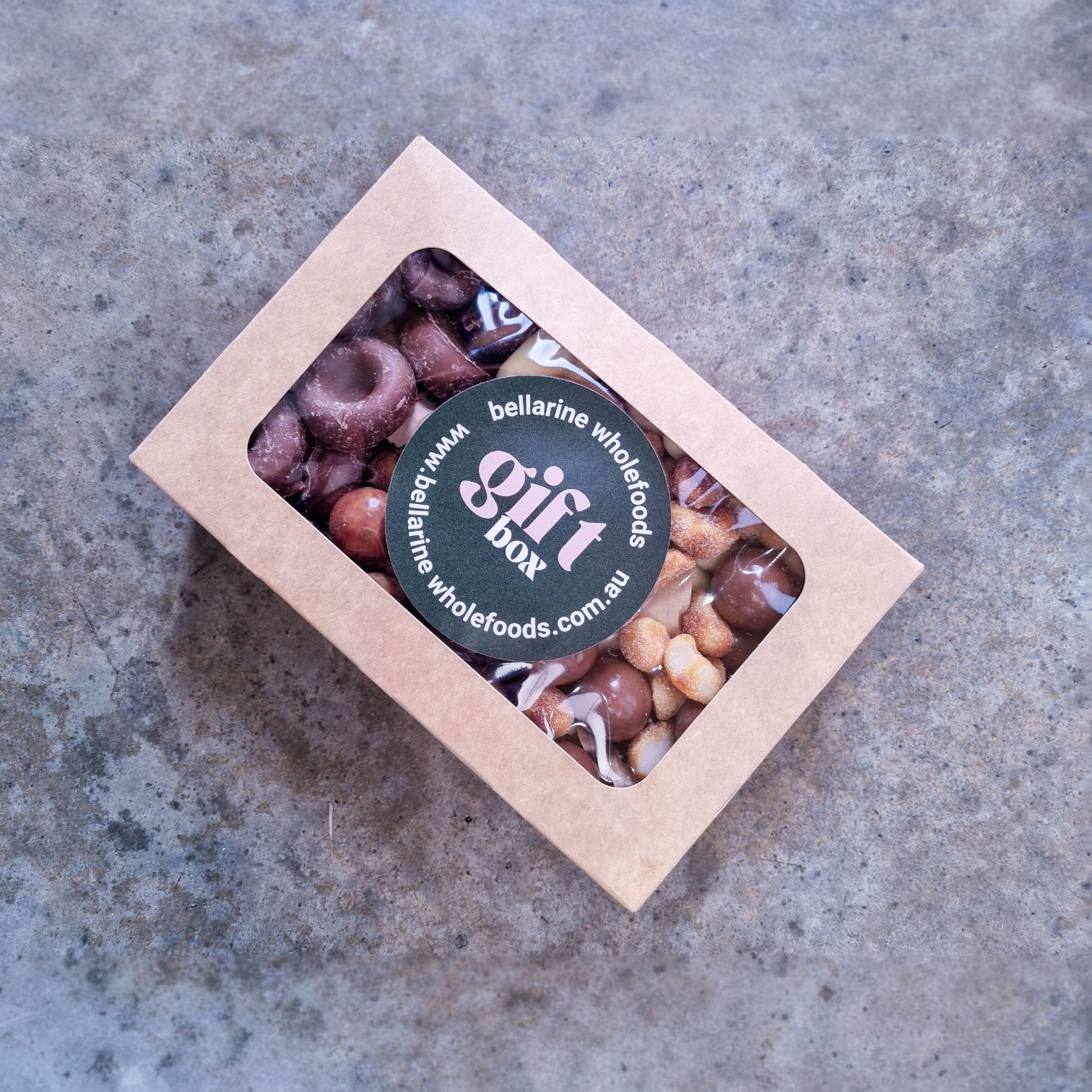 INGREDIENTS: Chocolate Aniseed Rings, Macadamia Moon Chocolates, Malt Balls Milk Chocolate, Honey Roasted Macadamias, White Chocolate Raspberry Bullets