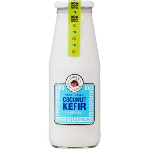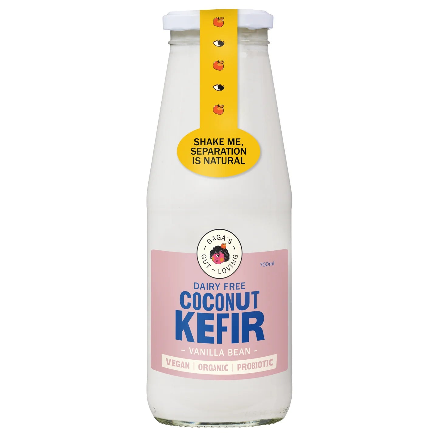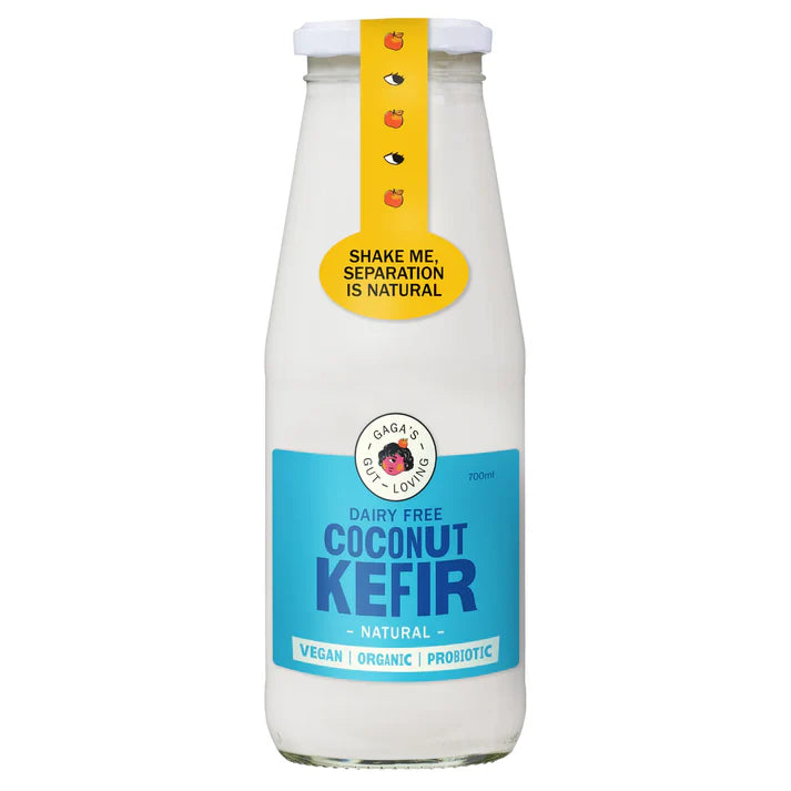 DESCRIPTION: Gaga’s Gut Loving Coconut Kefir is a probiotic-rich, dairy-free fermented drink designed to support gut health and digestion. Made from pure coconut water and live cultures, this naturally tangy and slightly fizzy beverage is packed with beneficial bacteria to nourish your microbiome.