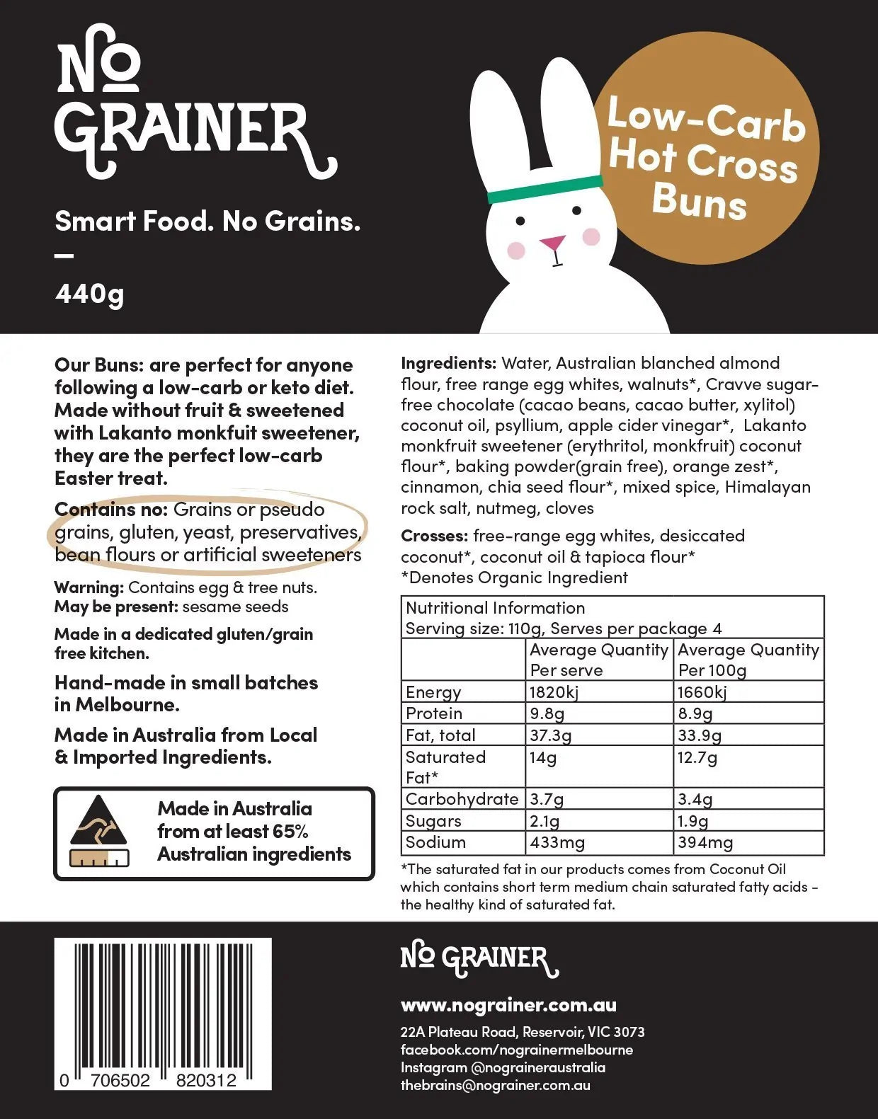 INGREDIENTS: Water, Australian blanched almond flour, free range egg whites, walnuts*, Cravve sugar-free chocolate (cacao beans, cacao butter, xylitol), coconut oil, psyllium, apple cider vinegar*, Lakanto monkfruit sweetener (erythritol, monkfruit), coconut flour*, baking powder (grain free), orange zest*, cinnamon, chia seed flour*, mixed spice, Himalayan rock salt, nutmeg, cloves. Crosses: Free-range egg whites, desiccated coconut*, coconut oil, tapioca flour*.