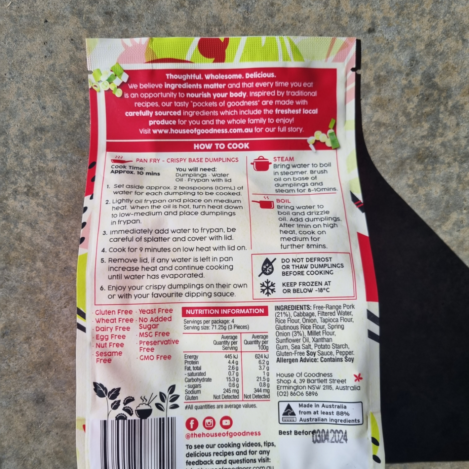 DESCRIPTION: House of Goodness gluten free gourmet dumplings go from freezer to plate in less than 10 minutes. Made with farm fresh local produce, they make an easy, delicious and nutritious weeknight meal or a wholesome snack. Pair it with your favourite dipping sauce. Pan-fry for a crispy base, or steam them with your favourite veggies.