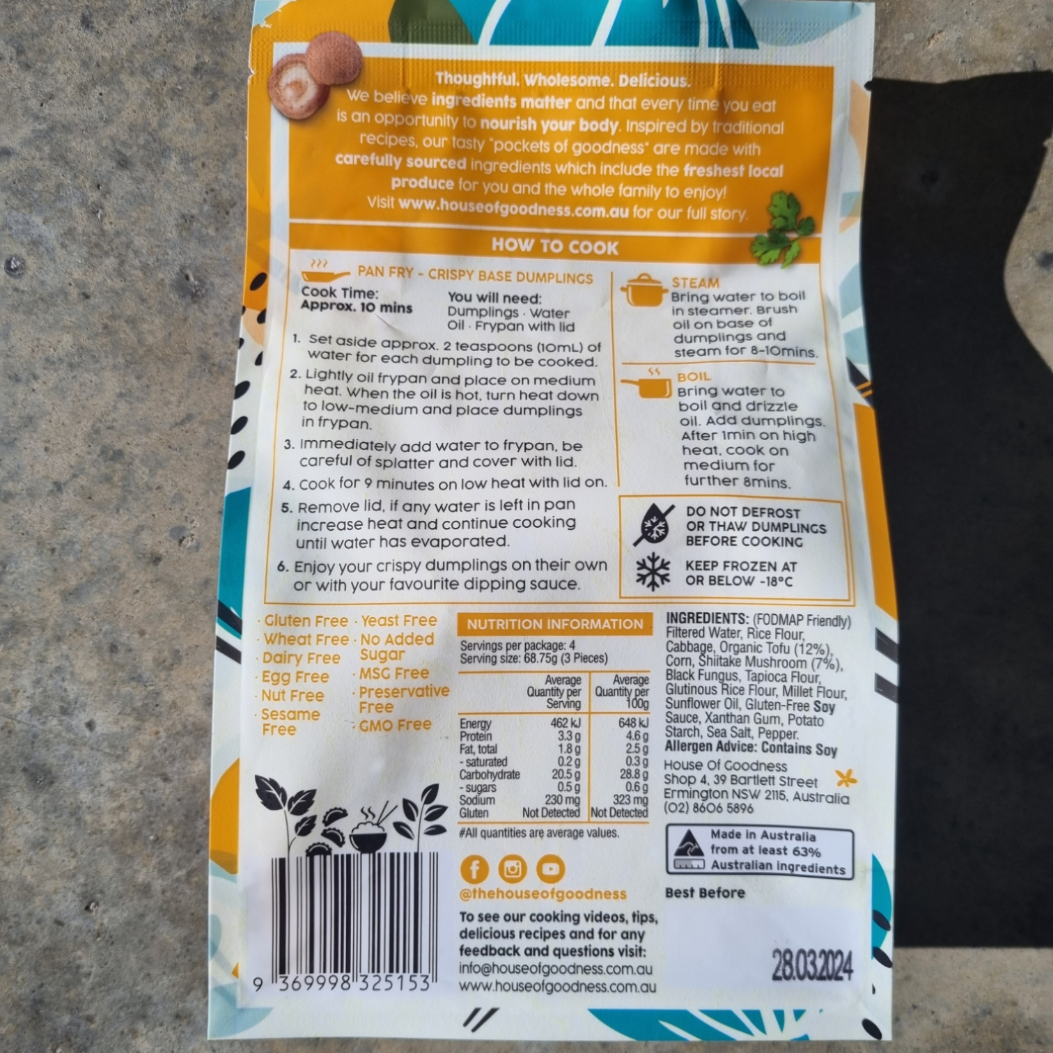 DESCRIPTION: House of Goodness gluten free gourmet dumplings go from freezer to plate in less than 10 minutes. Made with farm fresh local produce, they make an easy, delicious and nutritious weeknight meal or a wholesome snack. Pair it with your favourite dipping sauce. Pan-fry for a crispy base, or steam them with your favourite veggies.